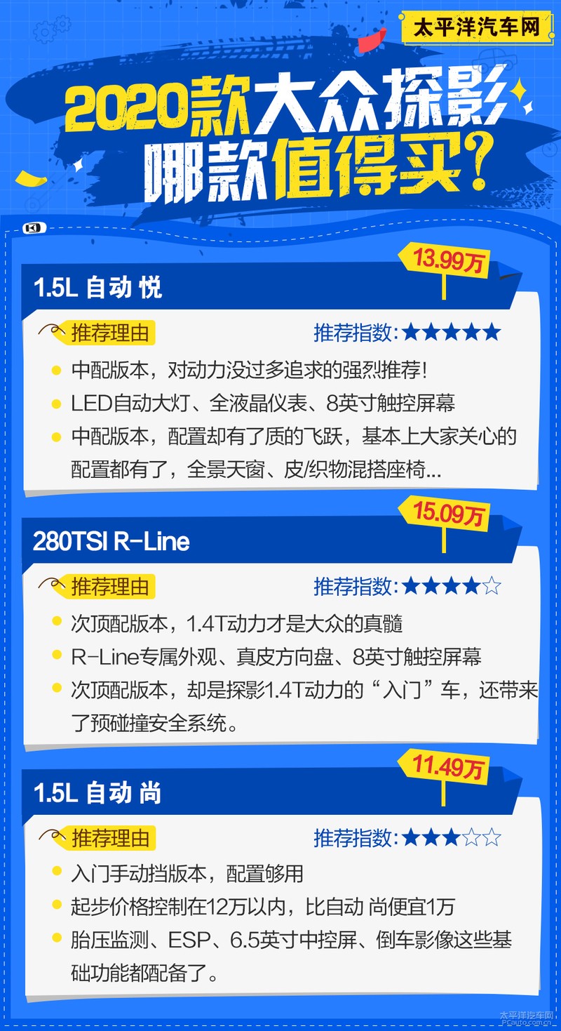 【尊流汽车网 导购员频道栏目】一汽-大众旗下第一款中小型SUV探影总算在昨天晚上正式上市,做为上汽汽车大众途铠的弟兄车系,探影算作重点登场的本年度重磅消息车系了。当场价钱发布的那一刻,让很多人都惊掉下巴,新手入门版价格便宜得超出任何人的预料,市场价区段为11.49-15.99万余元。新汽车出示了1.5、1.4T二种驱动力挑选,包含2款R-Line车系及一款至尊星耀限量车系,一共7款车系,到底如何选才划得来呢?然后往下看吧。