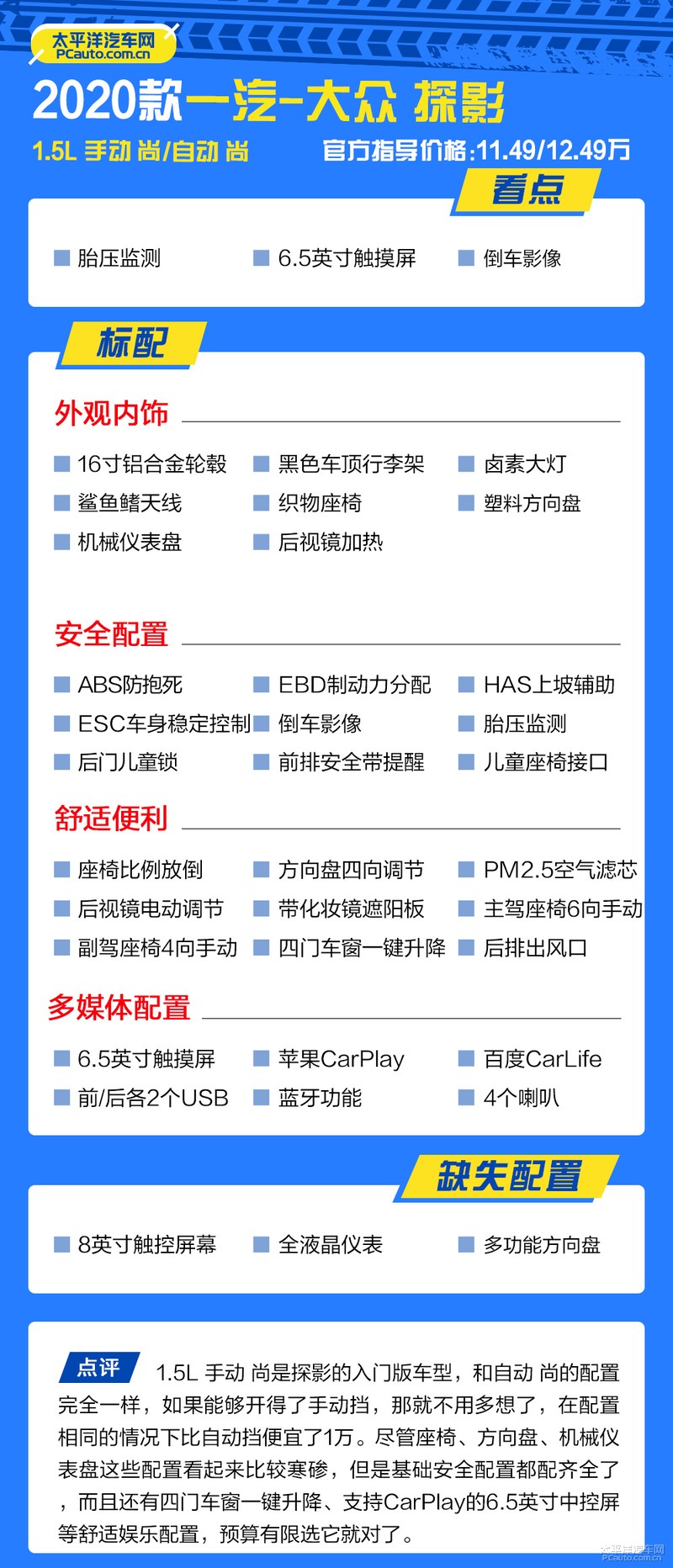 11.49万的新手入门价钱,的确让很多人都觉得非常惊喜,探影也随后变成了大家现阶段最划算的SUV。对比上海大众的途铠来讲,一汽-大众探影的手动档可以说独一无二的车系了,终于照料来到喜爱手动档的客户,而且价钱也是低得咋舌,相对于同配备的全自动 尚整整的划算了一万元。配备层面也算太虚,后视镜加热、6英寸大屏幕、四门车窗玻璃一键升降机、胎压监测装置、倒车后视这种居然全是全系列标准配置。