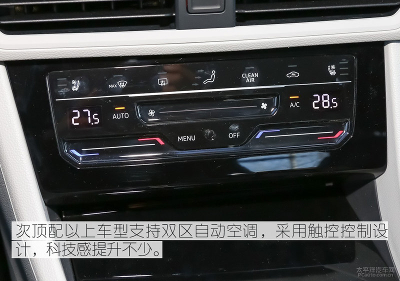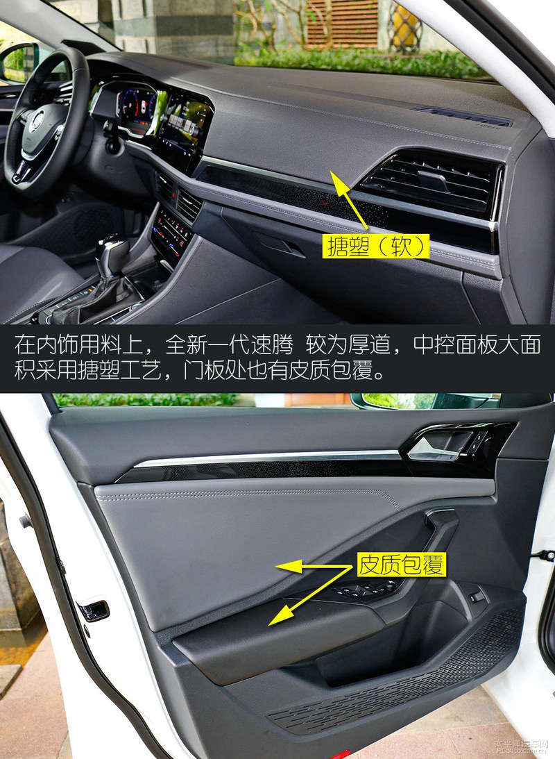 坐椅层面,全新升级一代速腾标配车系应用了纺织物材料,而次高配车系选用Alcantara 牛皮配搭材料,顶配车系则是选用牛皮材料。