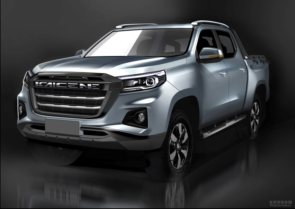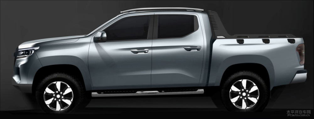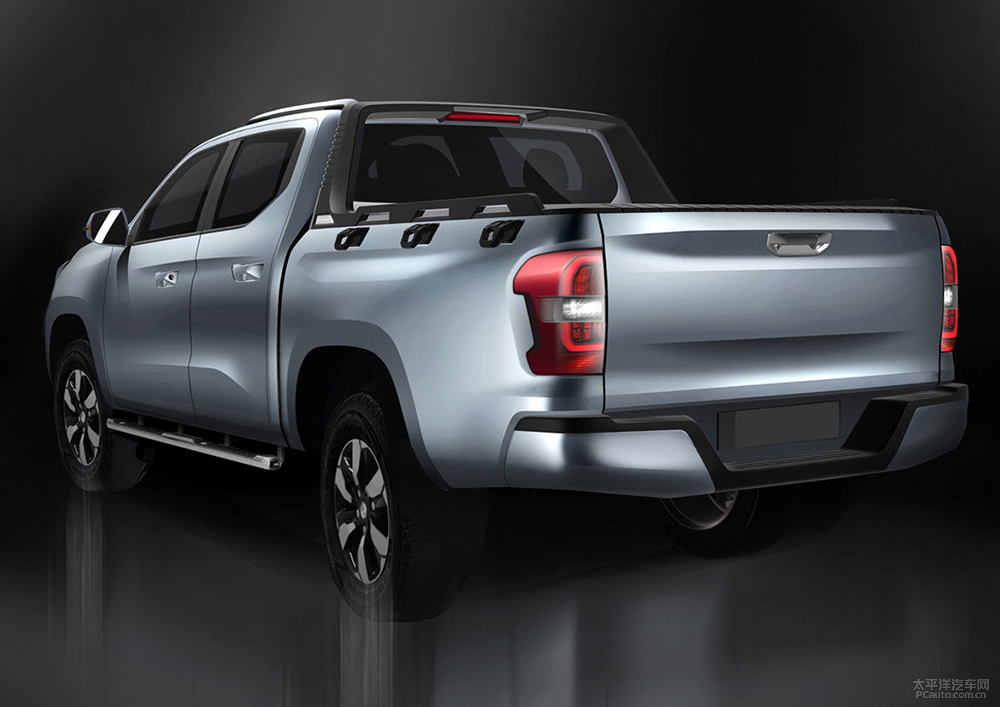 根据设计效果图能够看得出,在外型层面,新汽车选用了当下SUV及小汽车常用的设计语言,全车造型设计圆润,进气格栅选用三条幅式设计方案,考虑年轻一代时尚潮流个性化的出行需求。除此之外,此车柴油发动机机机盖两根“突起的全身肌肉”也是现代美式大皮卡常见的设计语言,与车顶架造型设计映衬,视觉效果上十分融洽。从车体侧边看,新汽车有着很大的接近角/离去角,根据工作能力脱俗。从设计效果图能够看得出此车四脚将应用尺寸较大全地形轮胎及六幅式铝合金轮圈,离地空隙极有可能在300mm上下,因而侧踏版的添加恰如其分,能有利于客户上车时。