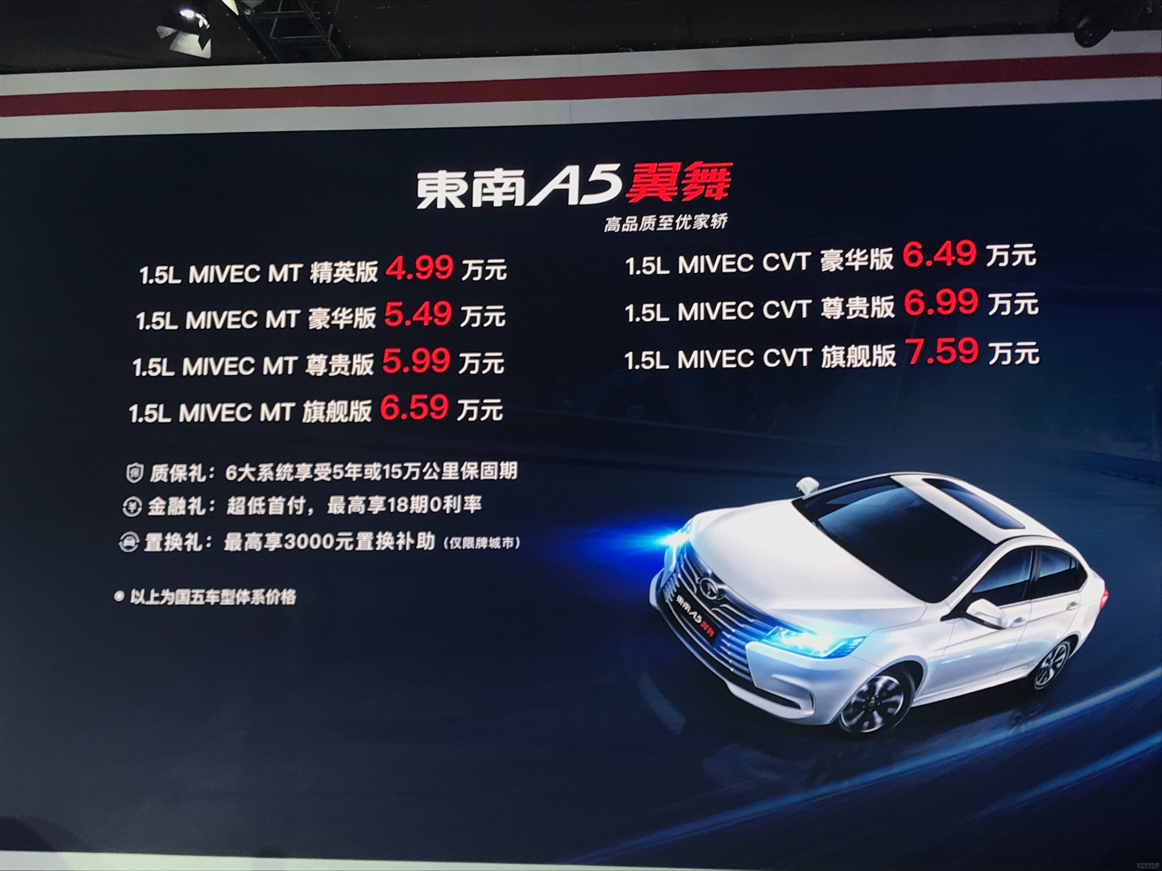 【尊流汽车网 新汽车频道栏目】东南汽车主打产品全新升级紧凑型级小汽车A5翼舞在这届广州国际车展正式上市,共发布7款车系,具体指导市场价区段为4.99-7.59万余元。