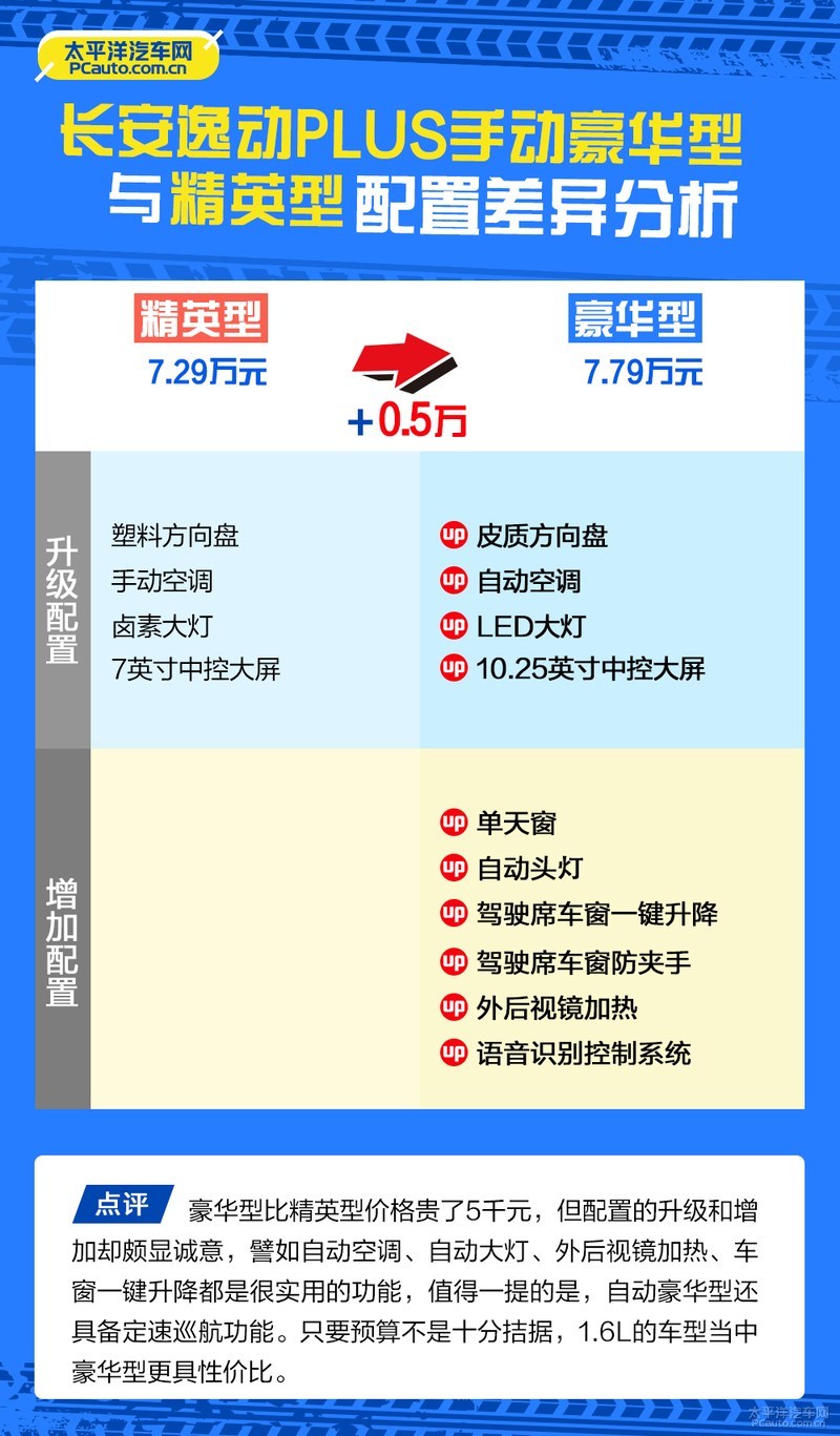 尊贵型和旗舰型中间的价差为一万元,针对标价十万元之内的逸动PLUS而言,这一价差算不上小,假如对高新科技配备、智能化系统不太发烧感冒,更享有安全驾驶所产生的快乐,挑选全自动尊贵型的逸动PLUS,也是可以的。