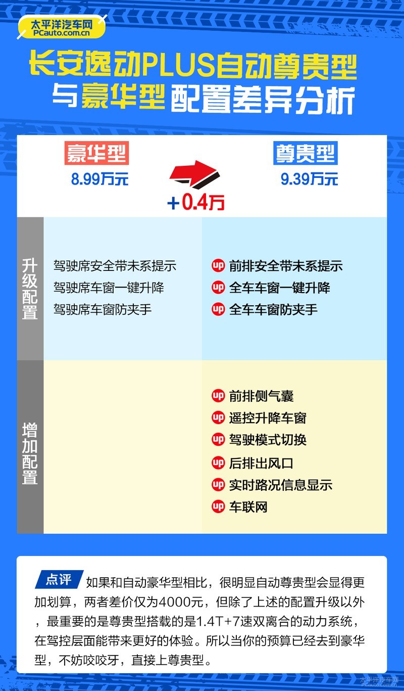 前边提及,逸动PLUS五个车系之中,最非常值得购买的是1.4T GDI 全自动旗舰型,那麼网民肯将会有疑问,一样配用1.4T蓝鲸发动机的全自动尊贵型,又值得买吗呢?大家看一下配备再剖析一下。
