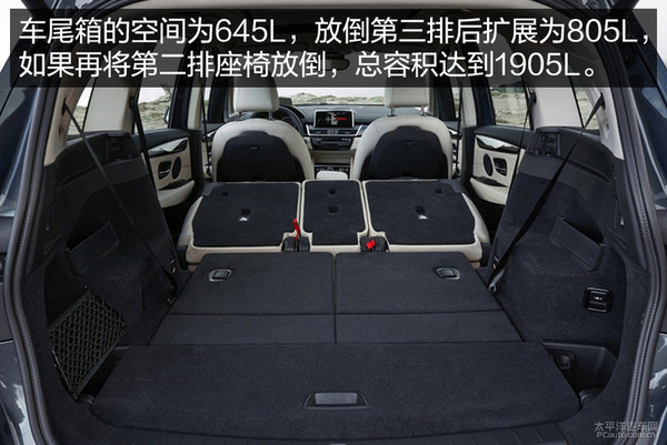 宝马2系Gran Tourer应用了七座“2 3 2”款式合理布局,第二排坐椅能够选用40:20:40的占比放倒,并出示前后左右导轨供坐椅挪动,而第三排坐椅则是能够选用50:50的占比放倒。2系Gran Tourer车尾箱室内空间为645L,放倒第三排坐椅后拓展到805L,假如还不够那麼放倒第二排坐椅后室内空间一瞬间提高至1905L。