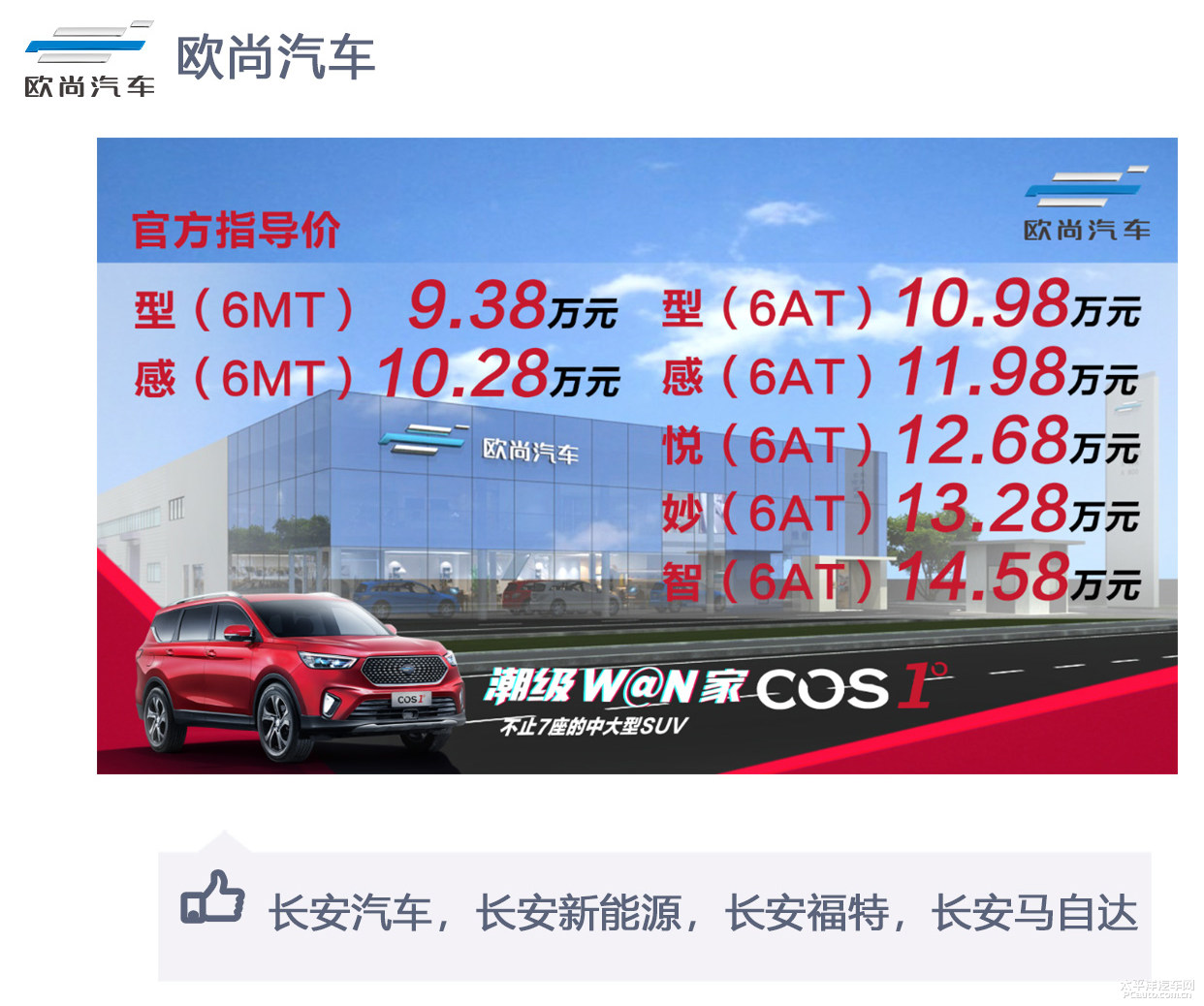 欧尚COS1°(科赛)车系频道 | 参配 | 图片 | 点评 | 论坛 | 经销商 售价:售价为9.38-14.58万元 |