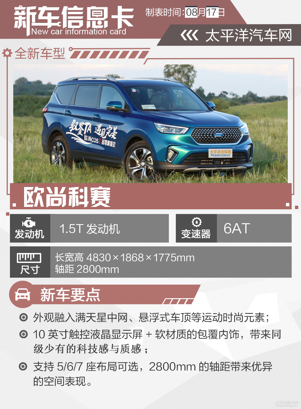 【尊流汽车网 新车频道】欧尚COS1°(科赛)于9月10日正式上市,售价为9.38-14.58万元。欧尚科赛定位为七座中型SUV,全系搭载1.5T涡轮增压引擎。