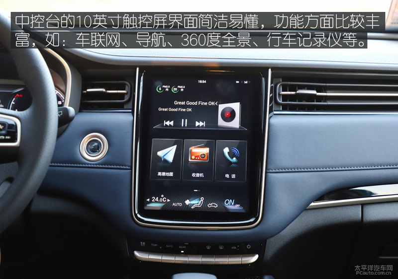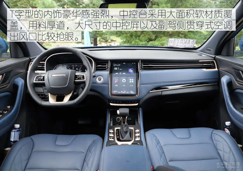 座舱以蓝色加黑色双色混搭设计,加以金色的饰条点缀,中控台竖状的10英寸触控液晶显示屏格外抢眼,软材质的包覆为内饰提升不少质感。