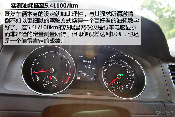 而假如把1.2TSI作如上的了解,那真有生产厂家所描述并预估的那样节油吗?说真话,还真有!在试架全过程中的往返道路,大家刻意用大部分人的安全驾驶方法检测了一下高尔夫球1.2TSI的综合性耗油量,結果在髙速和拥挤道路各占半的全线中测得了5.4L/100km的平均油耗(车载电脑显示信息),尽管還是要比国家工信部5.1L/100km的数据信息要高,但也确实十分叫人意外惊喜了。
