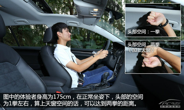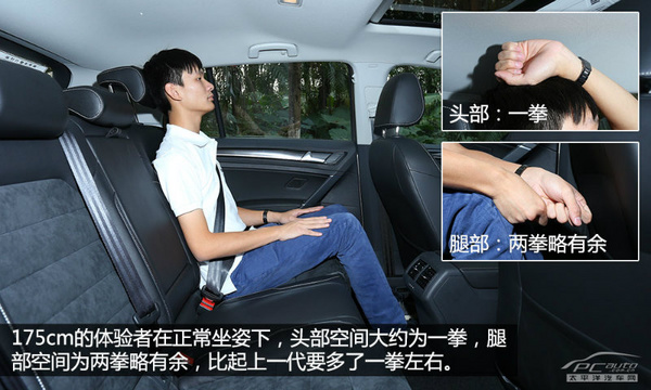 高尔夫7前座的室内空间与上一代沒有分毫差别,图上的感受者个子为175cm,在一切正常座姿下,头顶部的室内空间为1拳上下,假如算上打开全景天窗的室内空间一部分得话,那麼能够做到几圈的室内空间,那样的室内空间针对中国的绝大多数顾客而言,還是十分充足的。而归功于稍微延长过的车体,因此尽管外型看见仍然紧凑型灵便,但后排座的室内空间主要表现比想像中是好些上一些。
