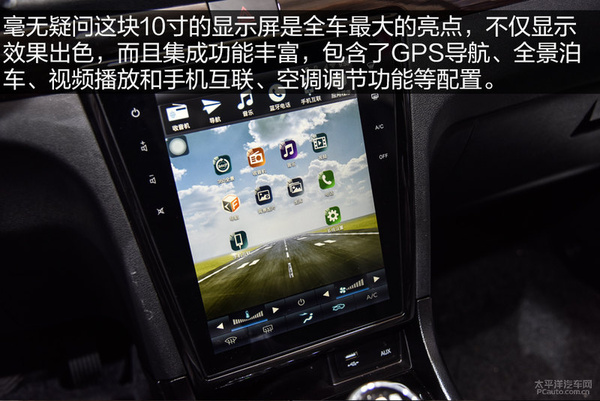 高配车型的中控处配上了10寸的高清彩屏,这块大屏不仅显示画质精美,还集导航、全景影像、手机互联等功能在内,操作的流畅程度基本已胜过目前大部分自主厂家的多媒体系统。
