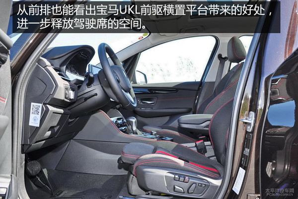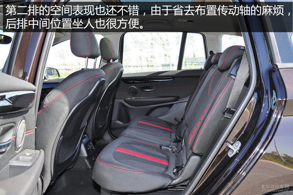 宝马2系Gran Tourer长宽高为4556*1800*1608mm,轴距2780mm;而2系Active Tourer则为4342*1800*1597,轴距2670mm。可以看出,2系Gran Tourer主要是车长方面增加了214mm以便容纳第三排座椅。而前两排空间的表现也让人满意,其中一重要原因是车子采用了前横置的发动机布局以及前驱的驱动形式,这是宝马UKL平台带来的利好。