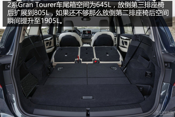 宝马2系Gran Tourer运用了七座“2+3+2”样式布局,第二排座椅可以采用40:20:40的比例放倒,并提供前后滑轨供座椅移动,而第三排座椅则是可以采用50:50的比例放倒。2系Gran Tourer车尾箱空间为645L,放倒第三排座椅后扩展到805L,如果还不够那么放倒第二排座椅后空间瞬间提升至1905L。