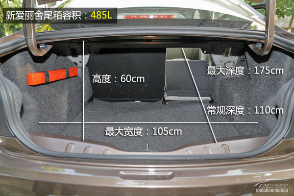 在家庭用户比较重视的后备厢空间方面,全新爱丽舍表现很不错,深度110cm、宽度105cm,几乎1:1的宽深比决定着它的空间利用率是相当高的,再加上可4/6分割放倒的后排座椅,载物扩展能力也很优秀。