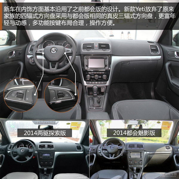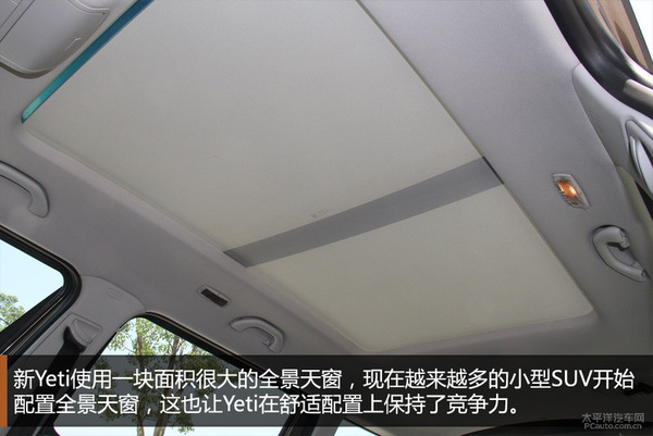 2016款Yeti在内饰方面基本沿用了之前都会版车型的设计,方向盘采用更为年轻有活力的三幅式设计,并且带有多功能按键,布局合理,操作方便。中控台采用大面积软质材料,配上精湛的装备工艺以及简洁易用的设计风格,没有什么可以挑剔的地方。另外,新车在内饰配色方面还新增了黑+灰配色,令人眼前一亮。新车还将全景天窗作为全系标准配置,如此厚道的做法,值得称赞。