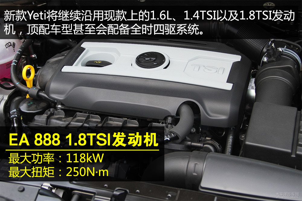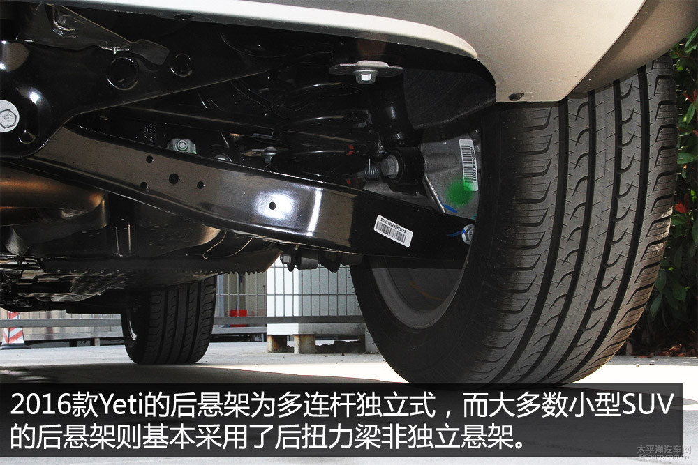 新款Yeti在动力方面沿用了现款车型上的三款发动机,分别是代号为EA211的1.6L自吸、1.4T涡轮增压以及代号为EA888的1.8T发动机。其中1.4T和1.8T发动机在实现强劲动力输出的同时很好地兼顾到了燃油经济性。不同的发动机对应的变速箱也不相同,1.6L只提供5档手动变速箱,而1.4T有5MT和7速干式DSG可选,顶配1.8T车型与6速湿式DSG搭配,并配备全时四驱系统。另外,Yeti采用了同级别少有的后多连杆独立悬架,操控性与舒适性与大多非独立后悬架车型相比优势十分明显。