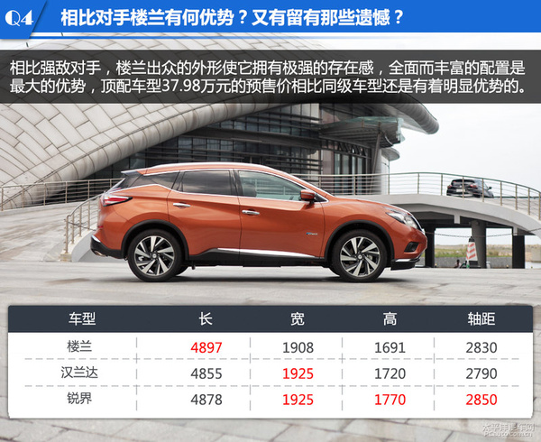 实际上从定位上来说,楼兰最直接的竞争对手是汉兰达和锐界,所以在身材方面,楼兰与这两个大家熟知的大家伙是差不多的。大尺寸一方面能让它看上去更有气势,另一方面能有一个好基础去打造车内的大空间。