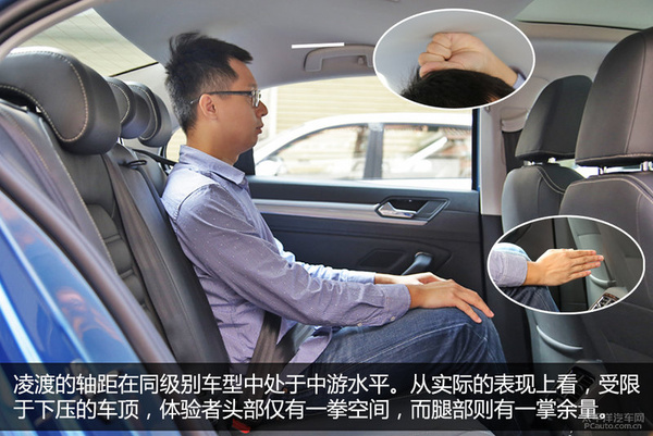 首先来报一组数据,凌渡的车身尺寸为4598×1826×1425mm,轴距2656mm,从各项指标看只能说是一辆普通A级车的正常表现。后排腿部空间的表现勉强合格,头部也因为车顶流线造型的缘故而打了折扣,不过凌渡胜在“宽体”一说,由此能明显感觉到车厢内部横向空间充裕,肩部和肘部自由活动的范围很大,就算坐三个人也应付得当。