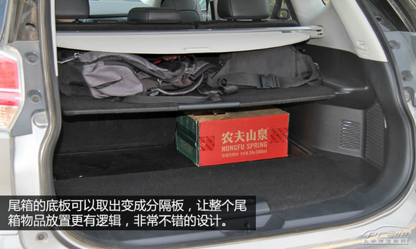 新奇骏在后备箱上做了不少人性化的设计,地板为两块拼接的设计,可拆卸,拆出来后可以直接架在后备箱中间,形成一个上下两层的格局,大大扩展了后备箱可用面积,两边也规则平整,真是又大又实用。