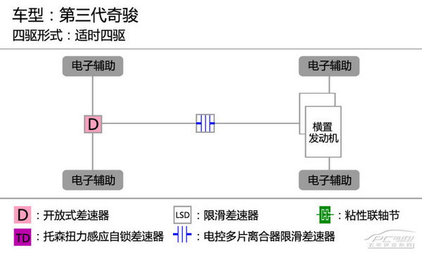 奇骏的四驱系统采用了多片离合器式四驱系统,受动力系统布局所限,多片离合器式的中央差速器被放置在后桥前端,利用油压的变化来向前后桥分配扭矩,另外车轮还带有一定程度的电子辅助制动,在遇到交叉轴状态时可以帮助其脱困。另外第三代奇骏虽然在结构上面没有变化,但厂商加入了YMC动态扭矩控制系统,同时还加强了B-LSD电子差速锁,最为惊喜的是,之前2.0L四驱车型也加入了B-LSD功能,整体的越野实力都有提高。而具体的越野体验,可以跳转到我们的体验文章详细了解。