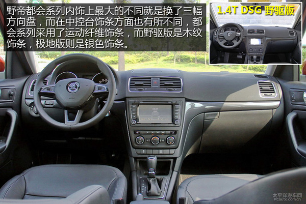 斯柯达Yeti的内饰有着比较典型的家族味道,依旧走的是简洁实用的路线。都会系列内饰同越野系列车型除了方向盘没有明显的不同,当然,仔细对比还能发现,中控台的装饰条也由银色改为运动碳纤维材质。