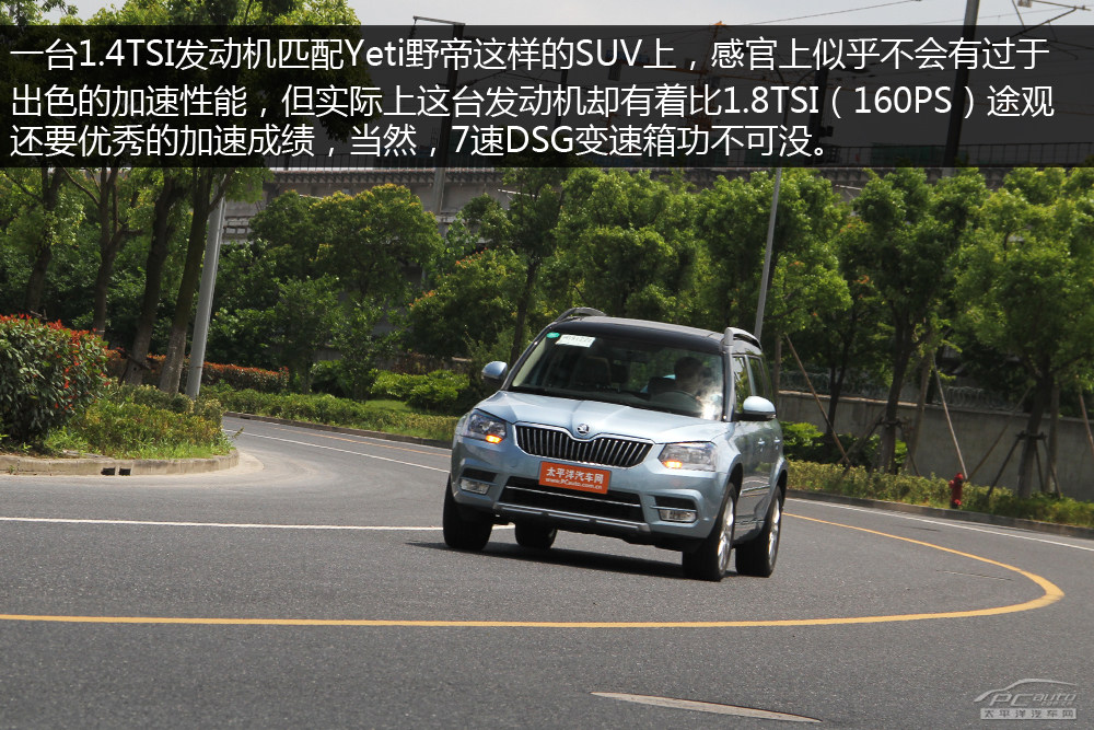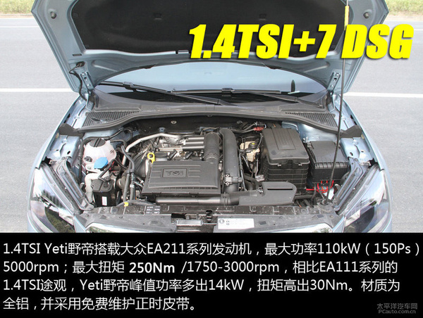 Yeti这台1.4TSI的EA211系列发动机要比途观上的那台EA111 1.4TSI发动机数据漂亮不少,最大功率高出14kW;最大扭矩也提高了30Nm,且发动机采用质量更轻的全铝材质,外加各厂家赖以宣传的“终身免维护”正时链条驱动。实际表现中,1.4TSI+7DSG野帝(9.5S/官方数据)百公里加速甚至要比1.8TSI途观来的更猛烈。