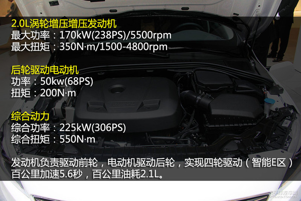 沃尔沃S60L 混动版,由Drive-E T5 2.0T L4引擎+电动机组成。其中发动机的最大功率为170kW(238PS)/5500rpm,最大扭矩为350N·m/1500-4800rpm,负责驱动前轮。而电动机的最大功率为58kW(68PS),扭矩为200N·m,负责驱动后轮。两者综合最大功率为225kW(306PS),综合最大扭矩为550N·m,两者混合实现四轮驱动(智能E驱)的模式,0-100km加速时间为5.6秒。