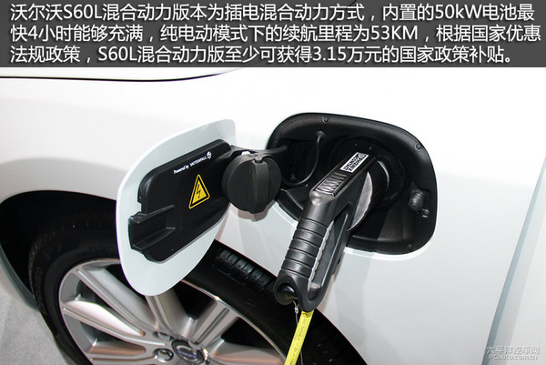 识别沃尔沃S60L混动版的最简单方法就是位于车身左前翼子板上的充电插头,使用附送+专业安装的充电桩,最快4小时可以充满电池,纯电动的续航里程达到53公里,可以得到国家3.5万元的节能补贴。另外电池寿命即便使用了5000次以后还能有80%的蓄电量,几乎可以说是电池与车同寿。