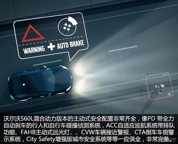 安全是沃尔沃最大的卖点,ACC自适应巡航系统带排队功能、FAHB主动式远光灯、PD 带全力自动刹车的行人和自行车碰撞侦测系统、CVW车辆接近警报、CTA倒车车侧警示系统这些功能全都能在S60L的混合动力版本身上找到。