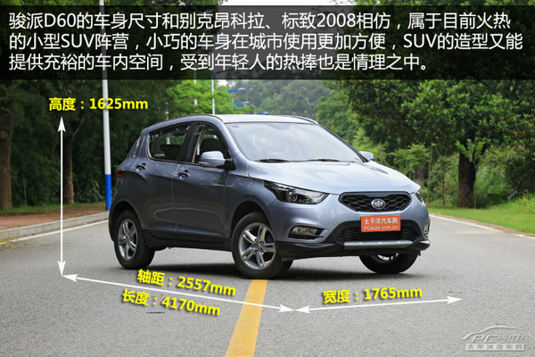 编辑点评:骏派D60是一款主打都市时尚风格的个性小SUV,它在造型上的设计确实蛮叫人眼前一亮,而且空间还是一大惊喜所在。但这个级别、这个价位区间的国产SUV竞争可是相当激烈,哈弗M4、长安CS35、瑞虎3都是实力强大的狠角色,而骏派D60在安全性方面的优秀成绩,无疑也给自己增加了更好的砝码,它目前要提升的,恐怕主要也就是品牌知名度了。