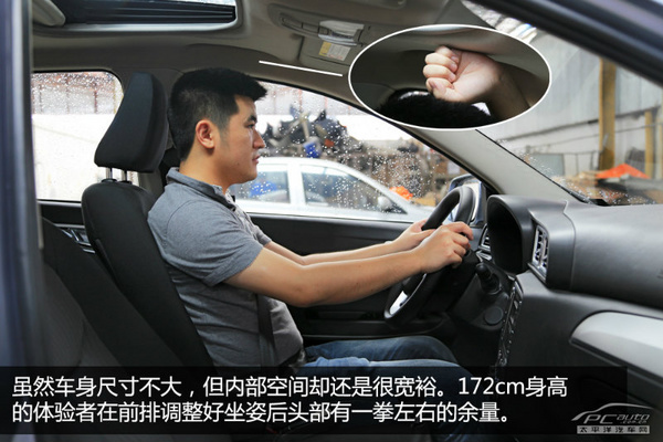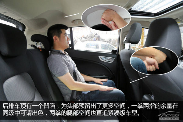 前排座椅从样式到空间表现都较为中规中矩,虽然外形极尽运动之能事,但座椅还是以舒适家用为导向,后排的空间相当不错,172cm身高的体验者轻松获得了两拳左右的腿部空间,后排车顶还有一个凹槽设置,提供充裕的头部空间。