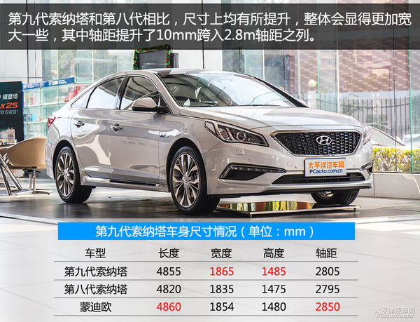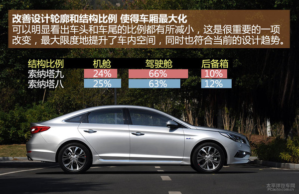 第九代索纳塔在保留了上一代车型长车头、短车尾特征的同时,还对乘员舱部分进行了扩容,这跟本田的“MM”理念比较相似,即机器最小化,乘员舱最大化。从数据上来看这一代车型对空间的改善还是很明显的,几乎推翻了上一代车型的工程基础重头来过,比如轴距部分增加了10mm达到2805mm;A柱前移23mm,C柱后推83mm,上述举措都为用户带去了足够宽敞的车厢内部空间,可以说此等表现不输任何一个同级主要竞争对手。