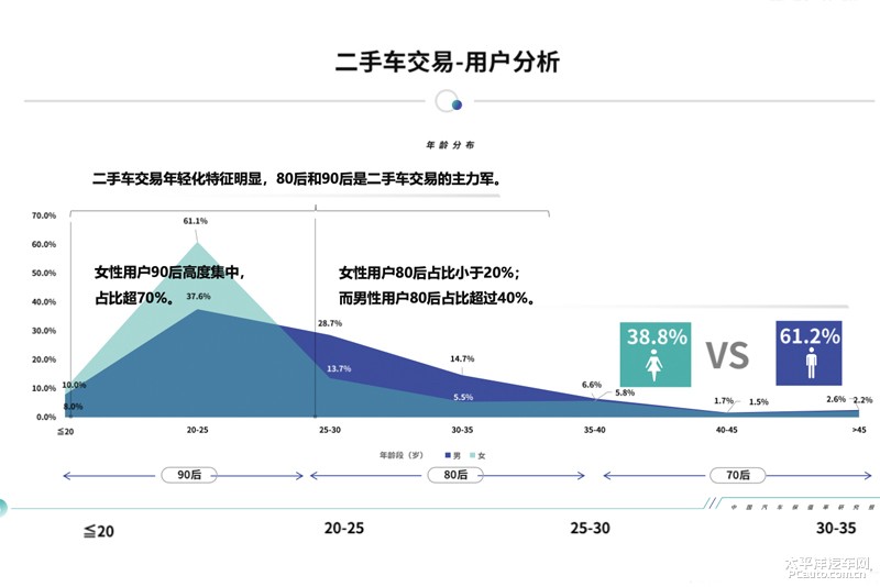 在二手车的选购群体中,三十岁下列的群体为主要消費人群,二手车一样存有消費人群低龄化的发展趋势。趣味的是,在其中的九零后女士顾客似乎对二手车更很感兴趣,在女士二手车消費群体中九零后的占有70%。由于女士顾客的身高标准、安全驾驶习惯性、及其审美观的关联,女士顾客对小型轿车或是紧凑型轿车更为的亲睐。因而该类车系的要求度,会依据消費群体集中精力而提升,进而提高汽车保值率。品牌形象的说,生日蛋糕就那么点,但大家都喜欢一边,那一边当然就贵了起來。
