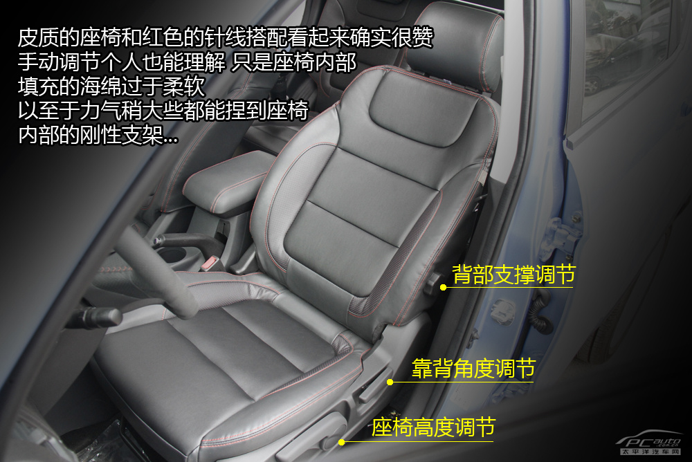 针对CS35的坐椅,最先得夸奖一下其灰黑色的皮层和鲜红色的针线活设计方案,看上去很能给人速度感。但是针对坐椅的舒适度,本人则不置可否,尽管坐椅材质很松,可是因为坐椅较为薄弱,在用力捏坐椅的椅背便能捏到支撑点坐椅的刚度支撑架状况下,毫无疑问舒适度上面有打折。