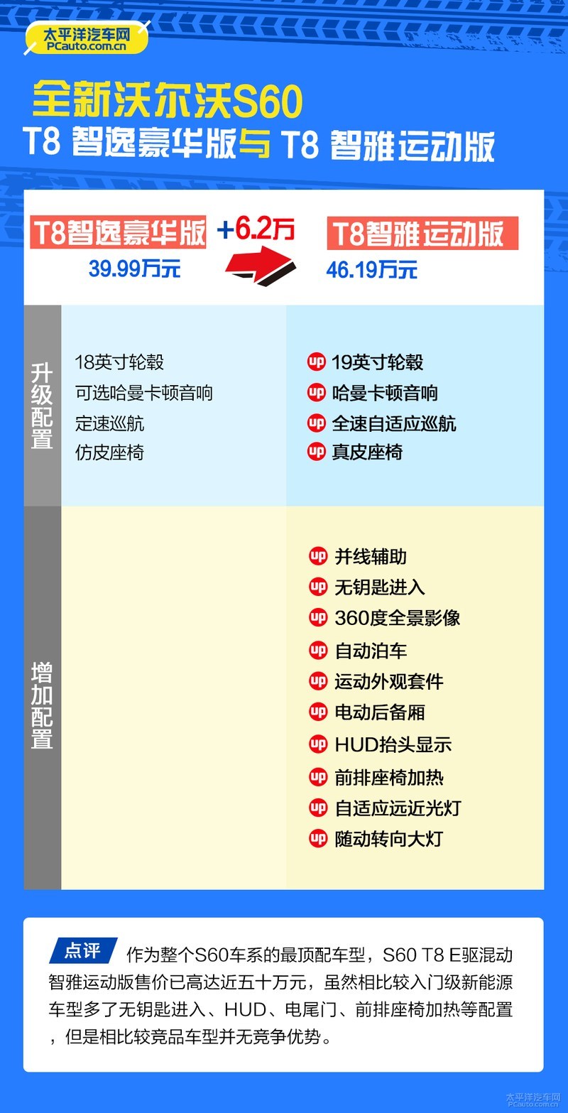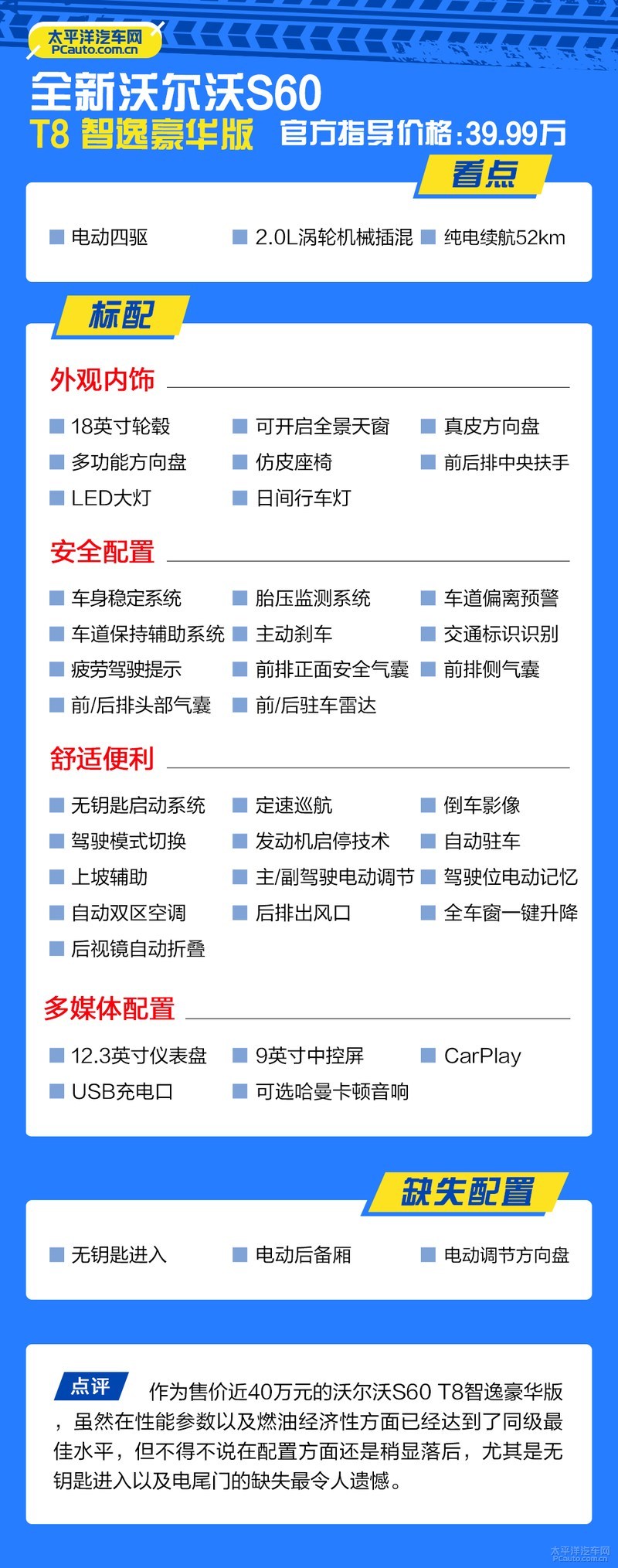 S60新能源汽车系,最吸引人的便是其电动式四驱系统及其强劲的汽车动力系统,不容置疑在这个一二线城市“一牌难寻”的时期,能寻找那样一台可以上新能源牌照,且估测还令人有一点安全驾驶冲动的车系早已十分不易了,而且在一部分地域还能够享有买车补助和免缴车辆购置税的现行政策,因此 新手入门版的T8 E驱混合动力 四驱智逸豪华型确实是一台很非常值得选购的车系,仅仅在配备层面稍有缺乏,终究近四十万的车都还没无匙进入及其电尾门确实很遗憾。对于高配的T8 E驱混合动力 四驱智雅运动版车系,融合市场价及其配备,其市场价免不了过高了些,假如中后期沒有更为诱惑的金融政策,在同级別中难以有竞争能力。