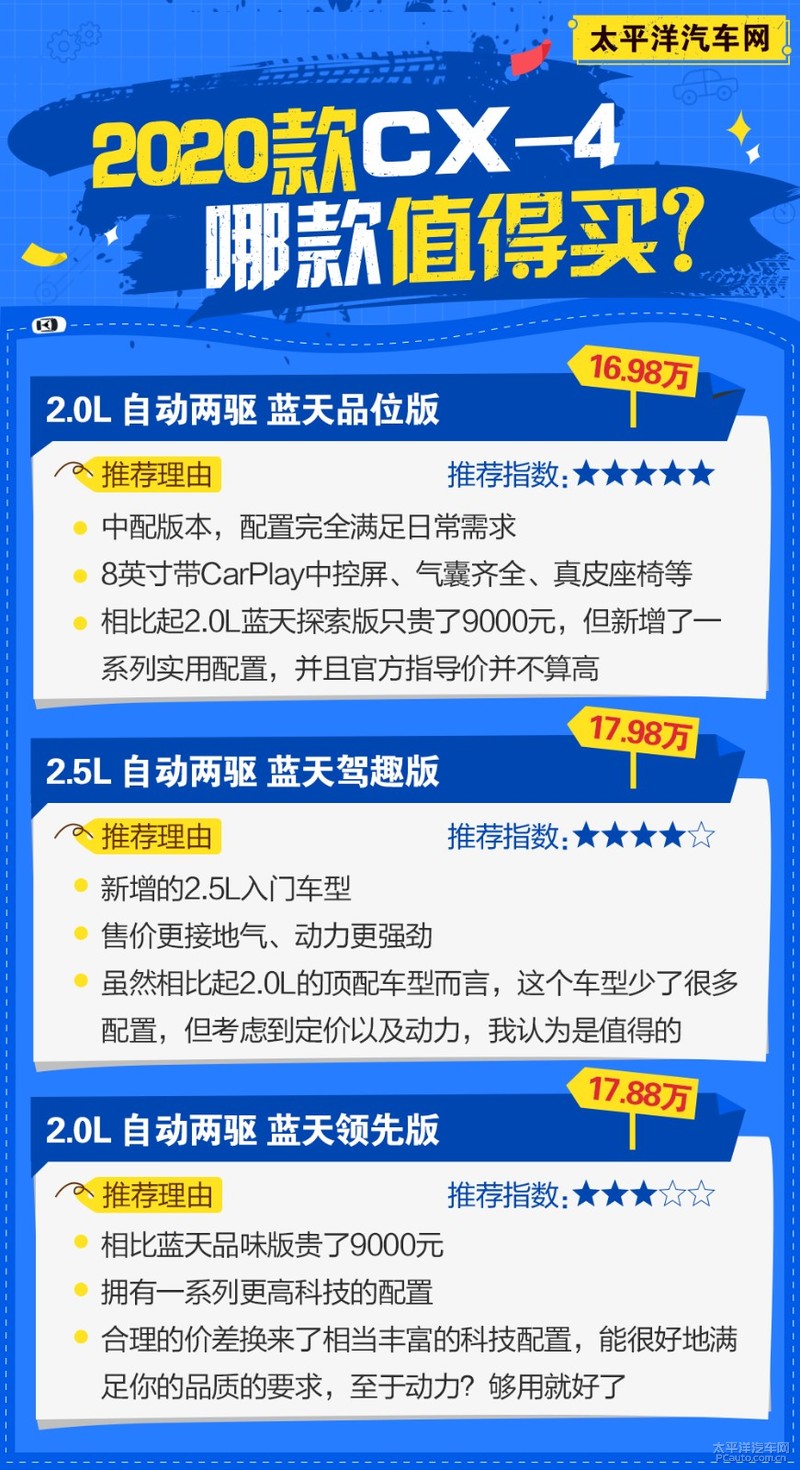 如同我刚才常说,现在有许多 的生产商都把导火索看准在轿跑车SUV这一细分化行业上,尽管马自达汽车CX-4发布的時间算不上长,但应对一个又一个的竞争对手迎面而来而上,因此 马自达汽车CX-4发布中后期换代车系刻不容缓。2020款马自达汽车CX-4在11月8日于长沙市发售,共发布8款车系,具体指导市场价区段为14.88-21.58万余元。那麼新汽车有什么转变?又有哪款最非常值得选购呢?
