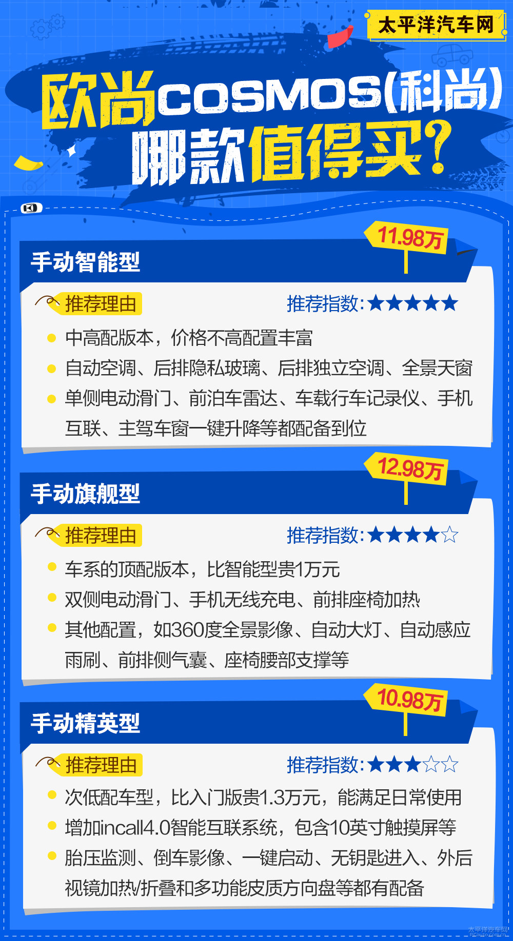 【尊流汽车网 导购员频道栏目】很早以前,欧尚是长安汽车主打产品的一个MPV系列产品,现如今发展趋势变成长安汽车主打产品的单独知名品牌。前不久,欧尚汽车主打产品的全新升级七座MPV——COSMOS(科尚)正式上市,官方网参考价为9.68-12.98万余元,出示汽柴油版和油电混合总共5款车系可选,新汽车全系列配用1.5T涡轮增压器柴油发动机(可选48V油电混合),配对6速手动变速器。对于哪一款性价比高最大,下边深入分析。