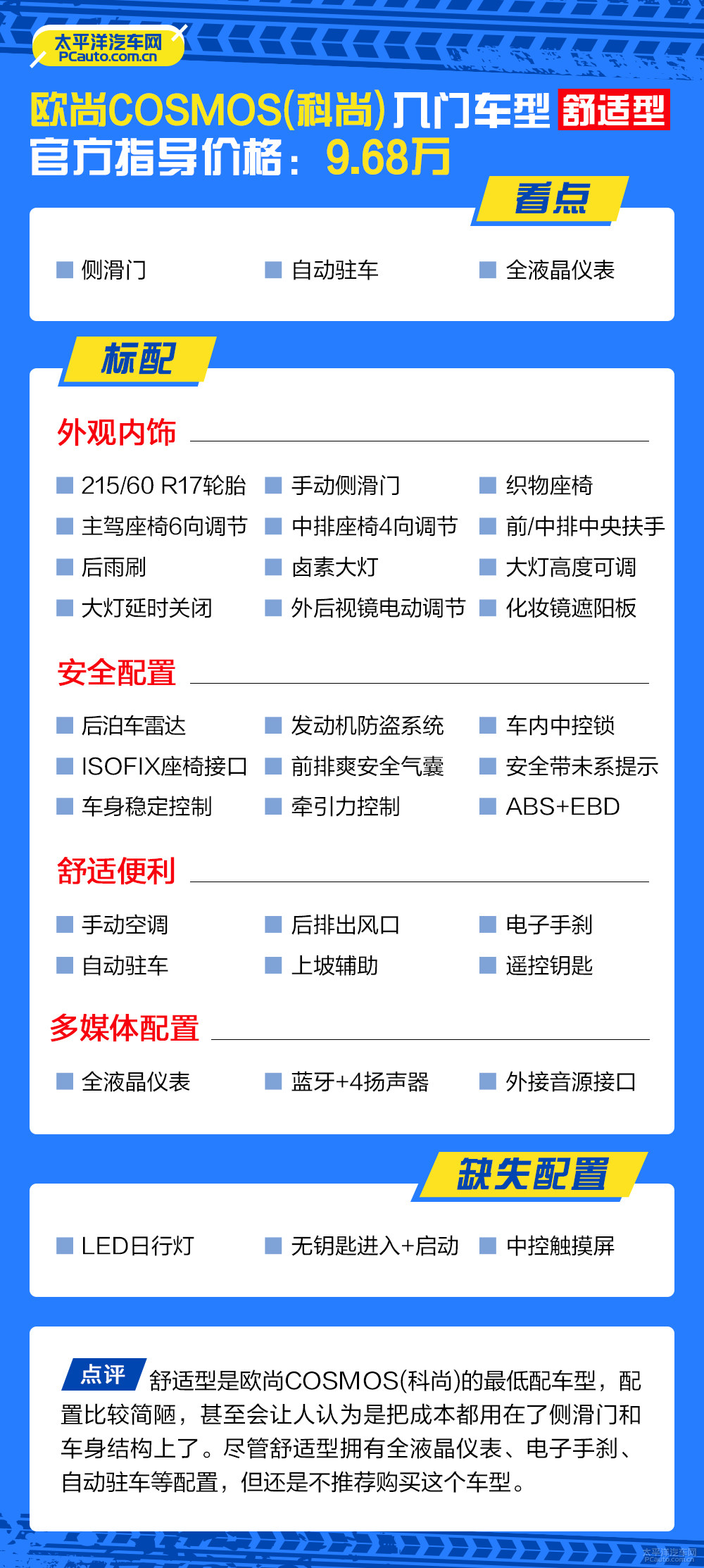 欧尚COSMOS(科尚)的起步费在十万元之内,它是较为引顾客的,终究它但是选用侧滑门,坚信大家都了解侧滑门的成本费和技术水平比侧开关门要高许多。舒适在配备层面的主要表现并不理想化,小编觉得是应用了“侧滑门”而缩小了别的配备的成本费,因此 像LED日行灯、倒车后视、智能汽车方向盘这些配备都无法保证全系列标准配置。但是,舒适配置了全液晶显示屏仪表盘、电子驻车、后排座通风口和车载蓝牙等。