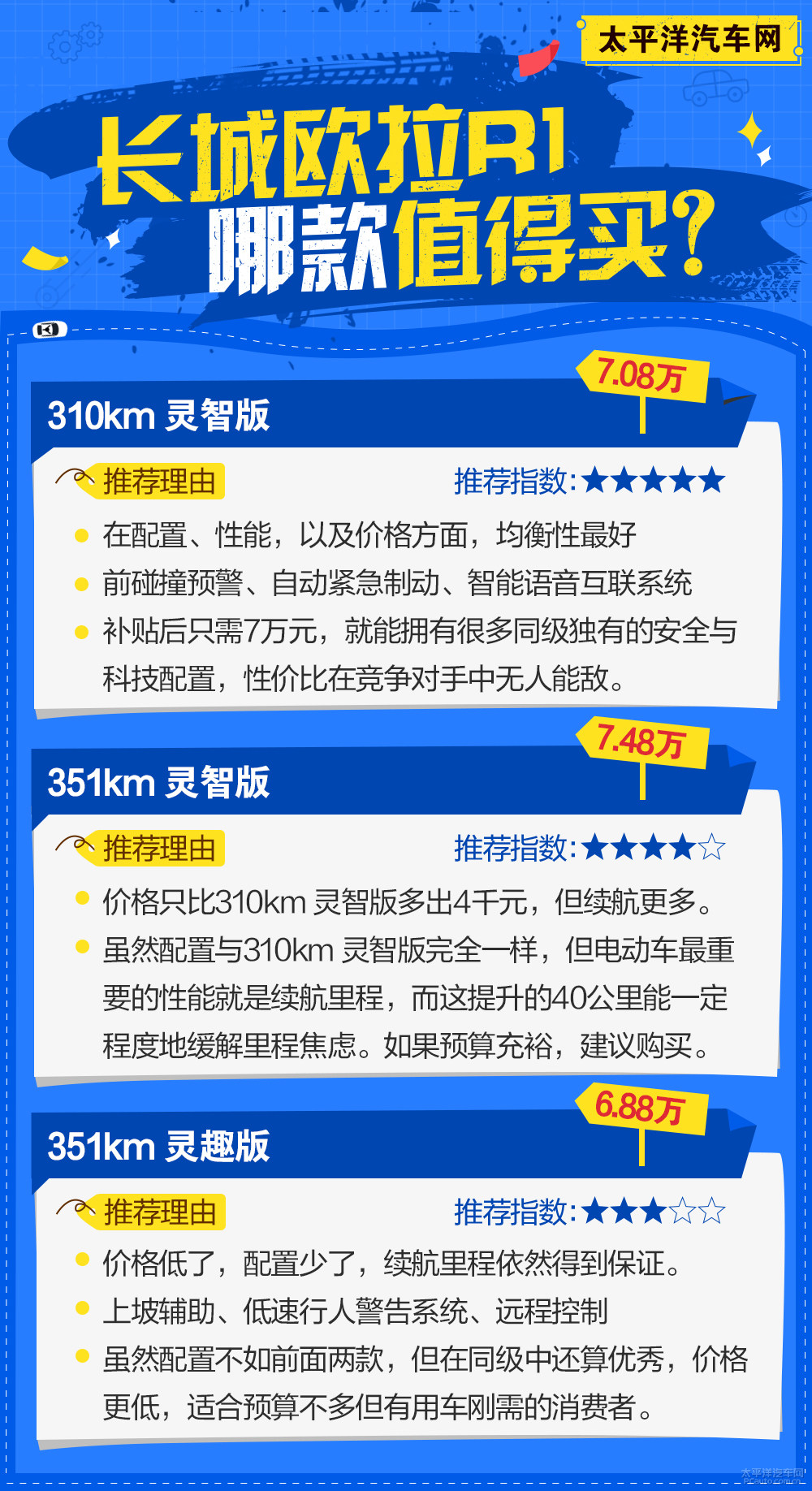 上周三,做为万里长城主打产品的新能源技术子知名品牌,欧拉自发布iQ系列产品后,总算又迈入了第二款车系——R1,其官方网具体指导市场价为11.48-13.78万余元,补助后市场价为5.98-7.78万余元。共发布6款配备车系,里程数分成310千米与351千米。不论是长相、里程数,還是性价比高,欧拉R1都比北汽汽车EC系列产品拥有 显著的优点,因此 在这里2款车系中该选谁几乎就并不是一个担心难题。该担心的是,欧拉R1选哪一个配备车系,才更合适自身。