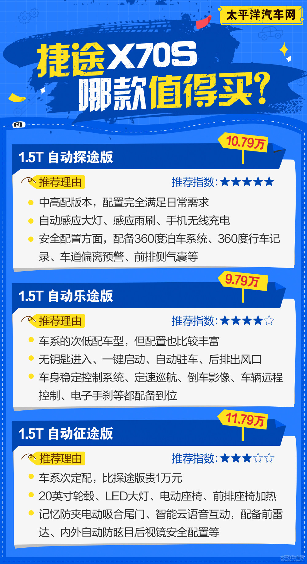 【尊流汽车网 导购员频道栏目】说到捷途汽车这一新的品牌汽车,坚信大家都较为生疏,实际上它归属于奇瑞控股,而捷途汽车在最近发布了主打产品的第二款车系——捷途X70S,新汽车根据X70升級而成,精准定位中小型SUV,与北京长安CX70、风光580等车系市场竞争。捷途X70S现有8款车系可选,官方网参考价为7.69-12.79万余元。那麼,到底哪一款性价比高最大?哪一款更合适你?下面就找答案。