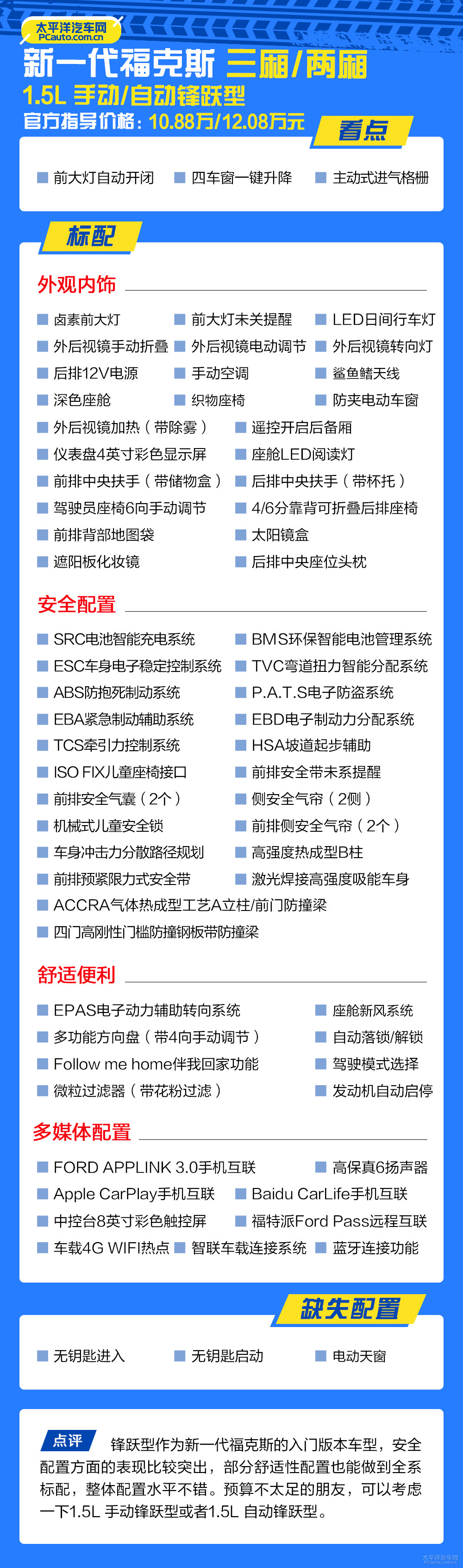 锋跃型尽管为最少配版本号,但其配备一点也不丐,乃至还一些意外惊喜,如全系列标准配置了自动大灯、主动型进气口、防夹车窗玻璃、半坡起步輔助、车体电子器件平稳操纵、车机互联和远程控制互连等,而安全性配备也是新一代车系的闪光点之一。