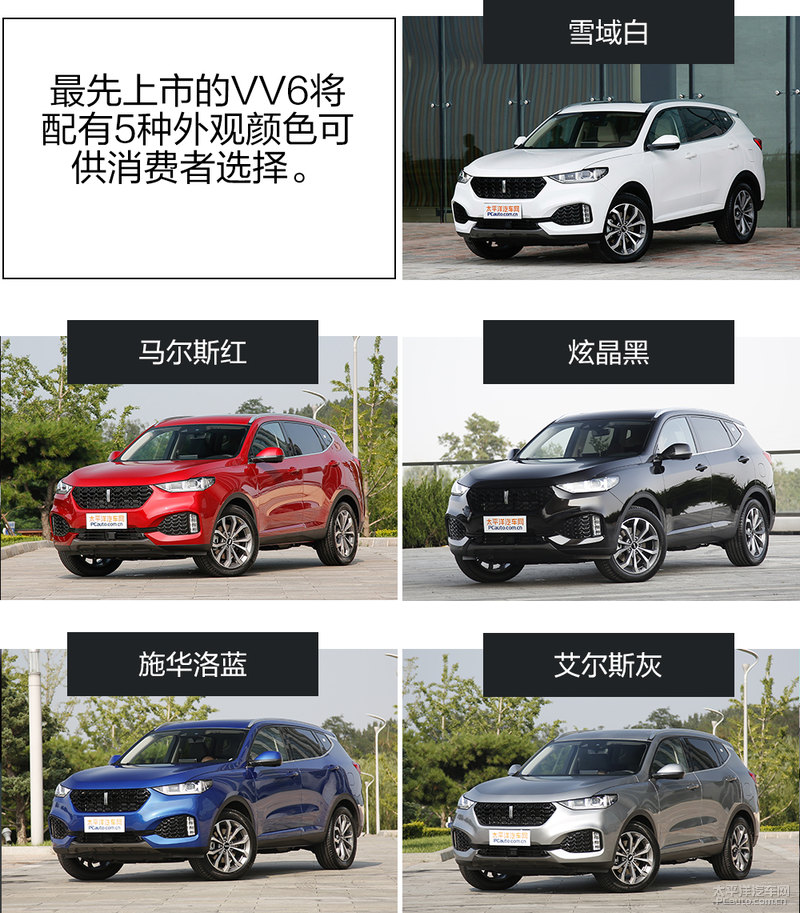 最开始发售的VV6现有5种色可供顾客挑选,在其中包含雪原白、马尔斯红、炫晶黑、施华洛蓝及其艾尔斯灰。并装有三种车内饰色彩搭配,各自为:黑色车内饰--和田墨玉黑,棕米车内饰--娜斯塔棕 莫扎拉米黄,黑棕车内饰--和田墨玉黑 雷蒙德棕。