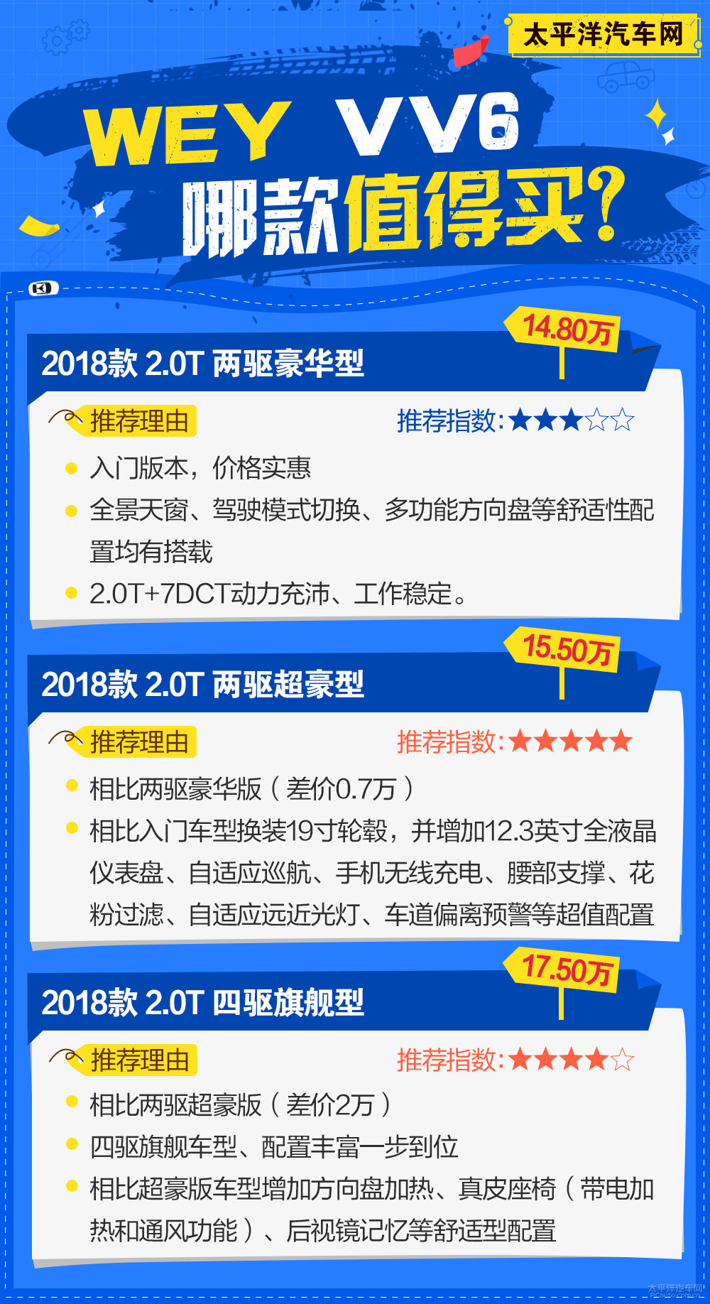 【尊流汽车网 导购员频道栏目】VV6是WEY知名品牌发布的第四款车系,尽管承传了许多前述车系的设计方案,可是VV6依然维持了自身的竞争能力。包含总体造型设计更为融洽,及其更适合的价钱区段,全是它在销售市场中的关键竞争能力。此外,此车也是做为WEY知名品牌第一款配用四驱的车系,也为VV6提色许多。假如你对WEY知名品牌早已钟意好长时间,那全新发售的VV6一定是个非常好的选购目标。对于实际哪一款车系最合适选购,看了本文你就知道了。