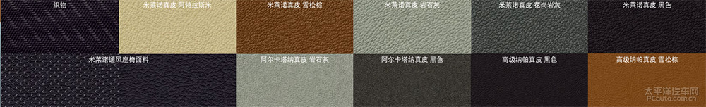车内饰皮层色调,依据不一样的配备和选配要求,出示了12种不一样色调和材料的组成。