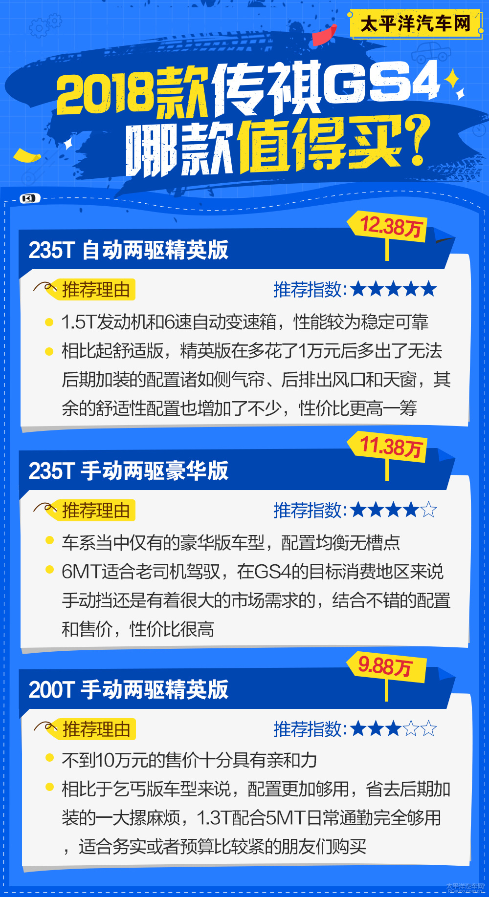 传祺GS4现有二种排气量的涡轮增压器柴油发动机可提供选择,只是是考虑于平时代步出行要求得话1.3T早已充足,1.5T车系则更合适对驾驶人员性有一定规定的人,对于挑选手动档還是自动档汽车得话还得看本人的要求和爱好。除此之外,用户评价最佳的6AT只在1.5T车系上配用,1.3T的自动档轿车车系只有出示双离合器变速器。