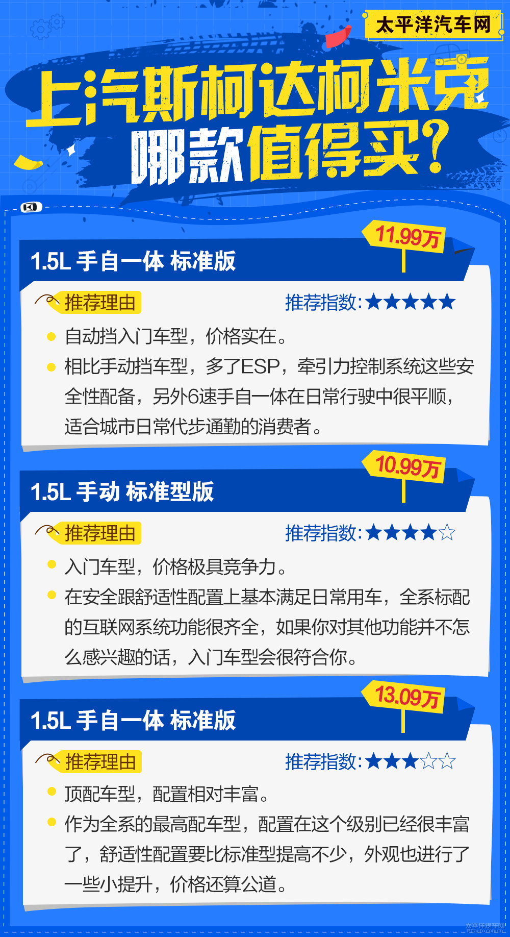 刚公布发售的柯米克,市场价价钱区段为:10.99—13.09万余元。积极推进1.5L一种排气量四款车系,在其中2款自动档轿车配对的是6速手自一体柴油发动机。