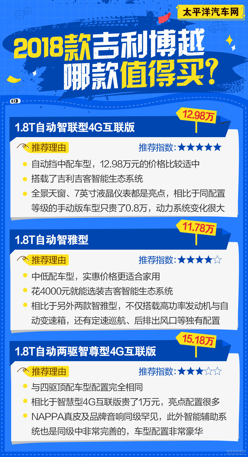 动力装置层面,2018款博越并沒有作出转变,依然是出示了2.0L和1.8T二种排气量柴油发动机,而且将1.8T柴油发动机做为低输出功率和大功率版本号各自配用在手动挡轿车和自动档轿车上。从数据信息看来,大功率版发动机排量提高了15kW,最高值扭距从250N·m提升来到285N·m,针对一款家庭装紧凑型级SUV而言这二种输出功率的柴油发动机实际上均可以满足需求,因而大量的影响因素還是价钱及其变速器的不一样。