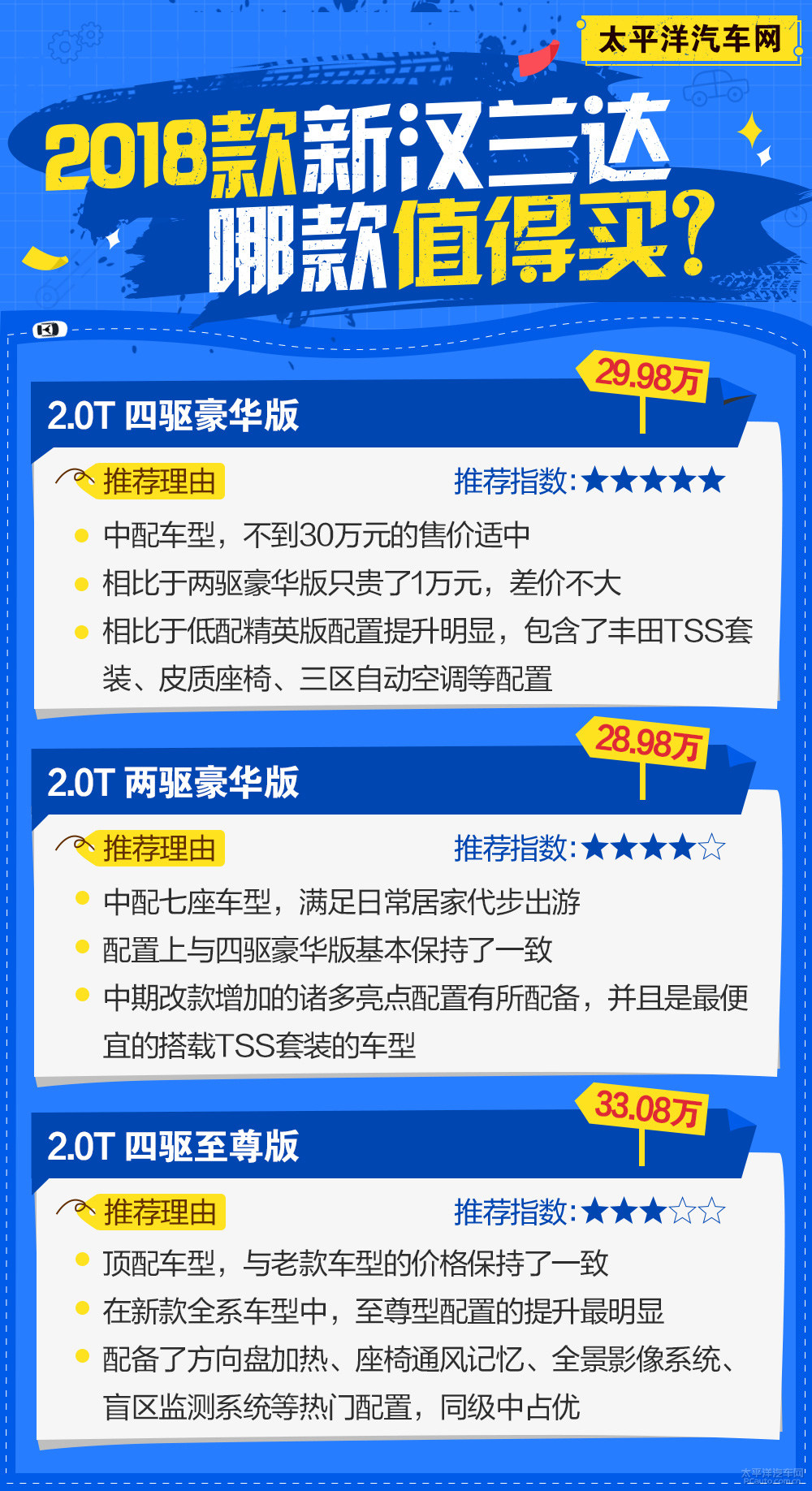 此次新汉兰达的出场,算作一次中后期换代,并且改的算作较为全方位的。新汽车在外型造型设计、配备(尤其是安全性配备)、动力装置及其车系上均有调节,这一“新”是能看得清的。新汉兰达一共发布了四个层面八款车系,包括四款两开车型及其四款四驱车型,在其中高贵版是增加车系。详尽车系及价钱见正下方一览表:
