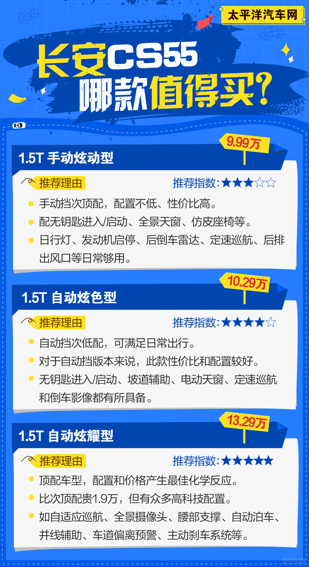 【尊流汽车网 导购员频道栏目】精准定位在CS75和CS35中间的北京长安全新升级SUV CS55在此前发售,新汽车驱动力层面全系列标准配置1.5T模块,出示5MT和6AT可选,市场价区段为8.39-13.29万余元。新汽车现有8款车系,应当怎样选才可以购到性价比高最大的车系呢?下面对你说。