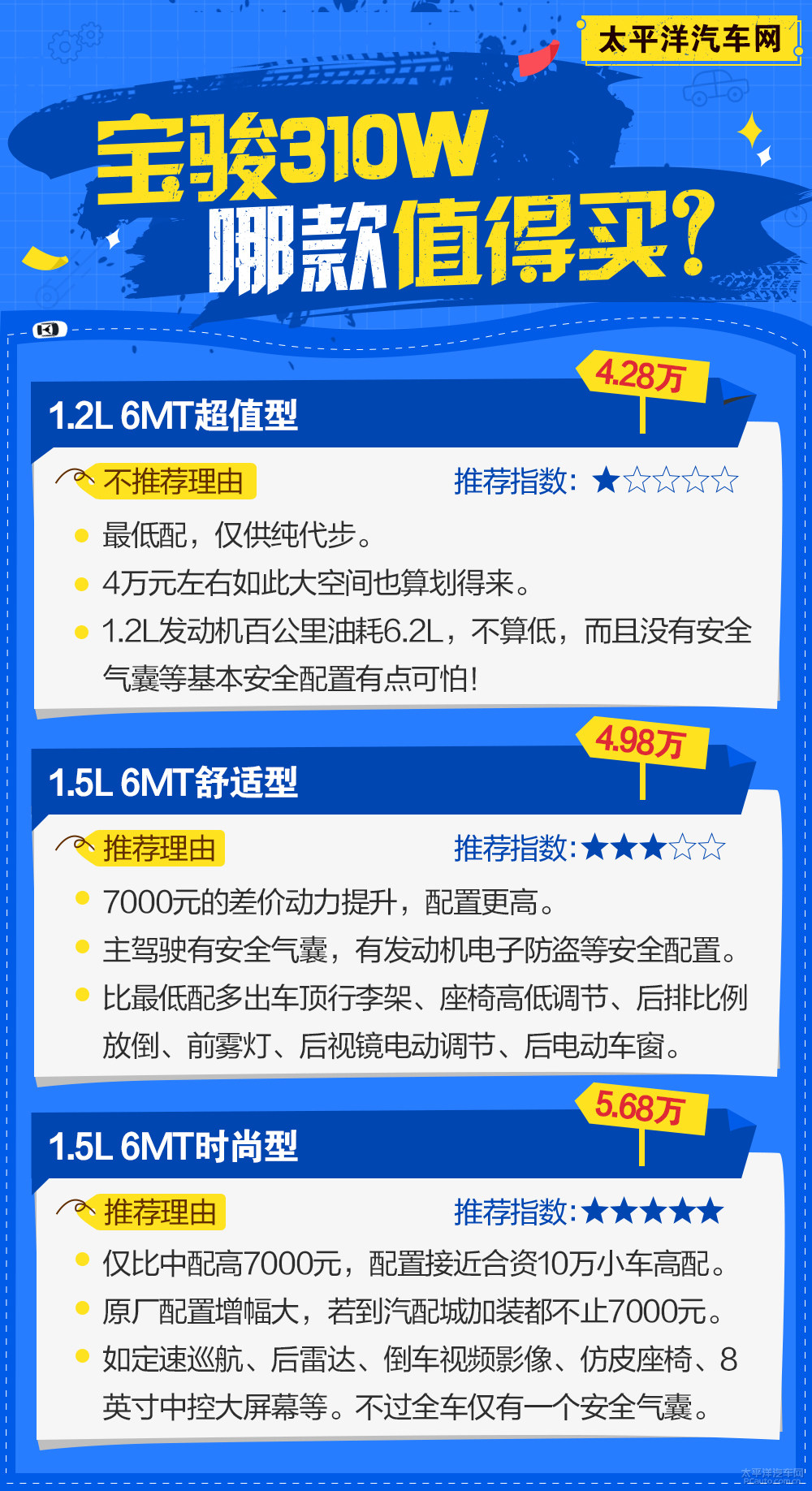 选购提议:假如您对本身安全驾驶水准较为有信心,不容易出安全事故,又换句话说您仅仅期待有一台能够供短路线运东西、家庭装代步出行的车,那麼宝骏310W的最少配车系,也不是不能考虑到。