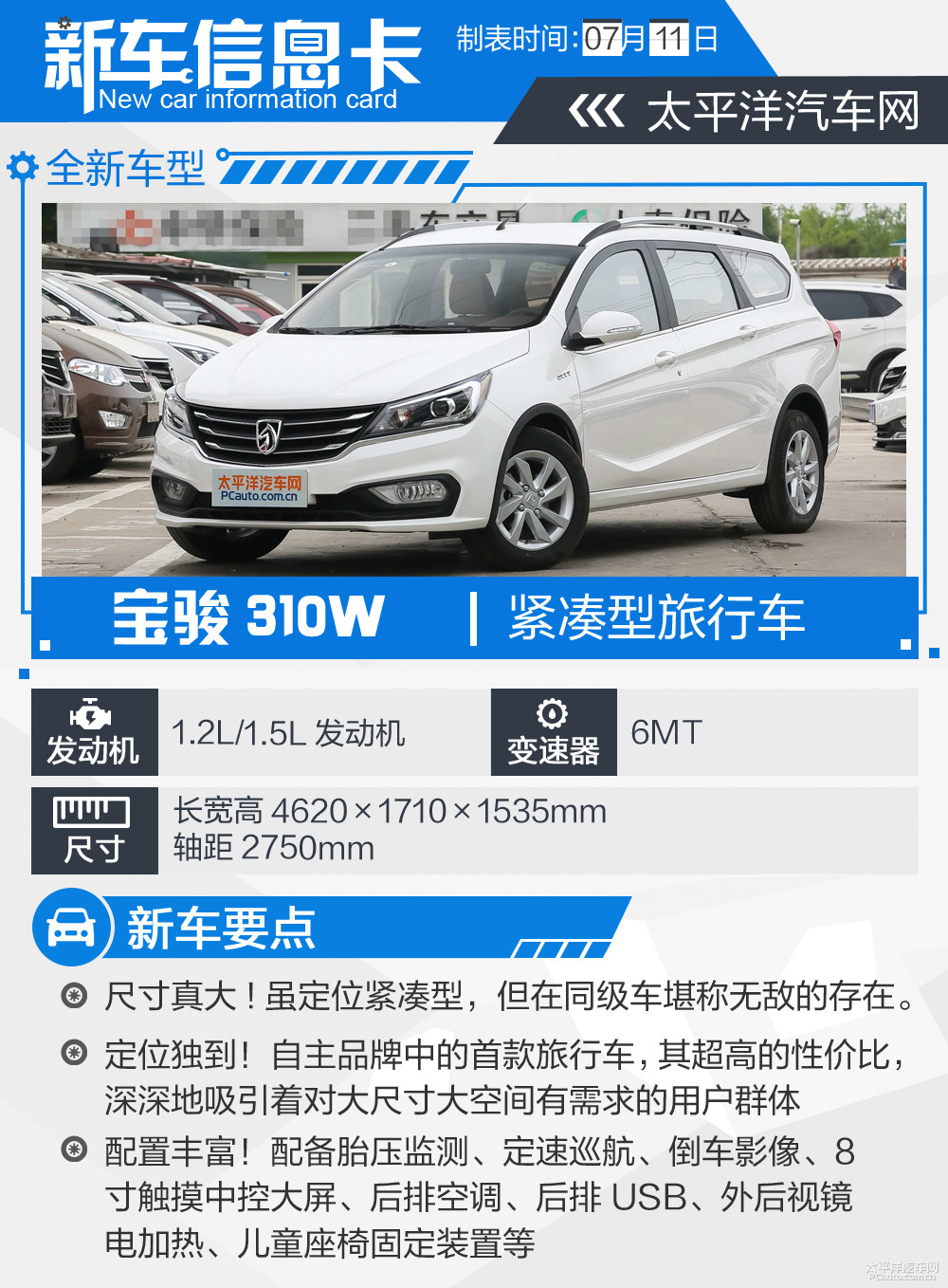 车体规格层面,宝骏310W的尺寸各自为4620/1710/1535毫米,轮距为2750毫米。据了解,新汽车的储备厢容量为740L,当后排座坐椅所有放平后,其容量较大可扩大至1460L。
